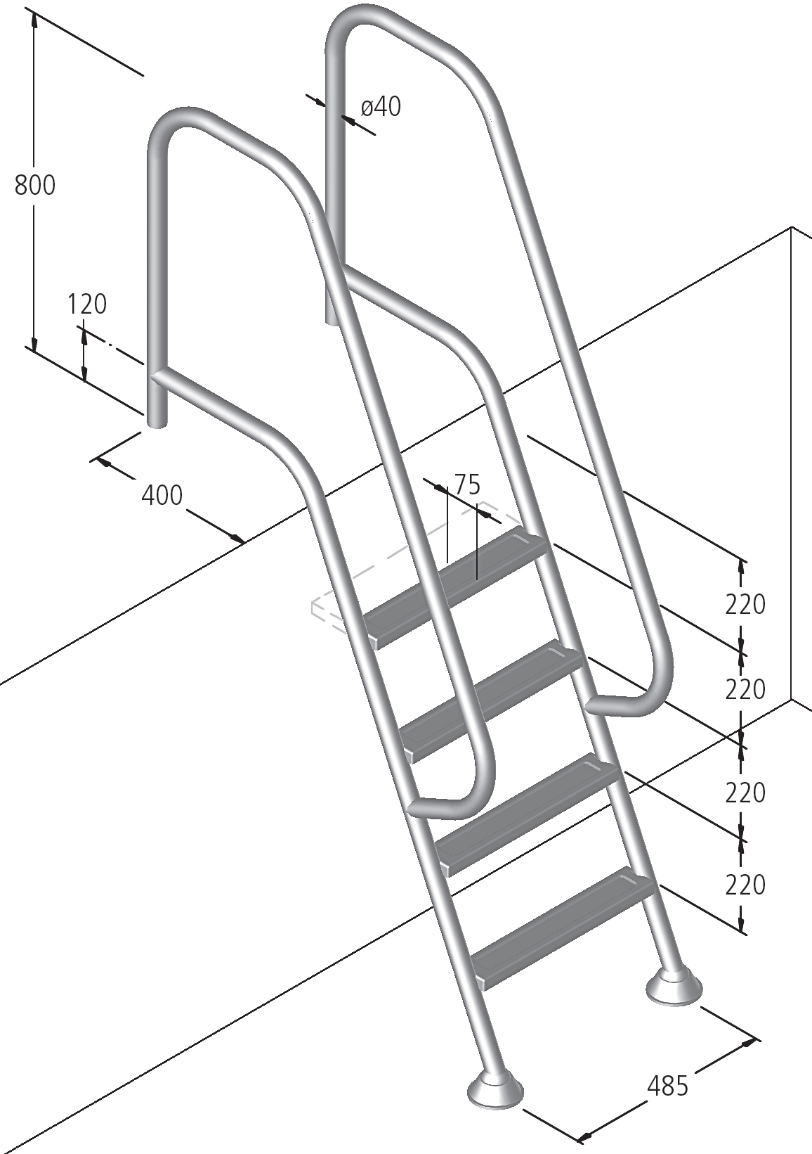 Drabina wykonana ze stali nierdzewnej posiada od 4 do 8 stopni. Produkt jest jedno-elemetnowy. Uchwyt nachylony jest pod kątem 24 stopni.